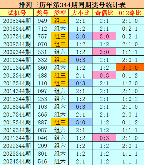012路分析:历史上成列三第344期同时奖号中,012路奖号总个数比为25:17:15,012路奖号轮空期数比为4:5:7,本年第344期瞻望012路号码均衡出现,照顾012路比1:1:1。