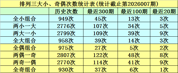 承接10期奖号中,全大格局开出2期,全小格局开出1期,两小一大格局开出3期,两大一小格局开出4期,本期大小格局判断:两小一大奖号。