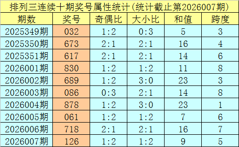 上期讲究:成列三第2026007期奖号:126。类型:组六,奇偶格局:奇偶偶,大小格局:小小大,和值:9,跨度:5。